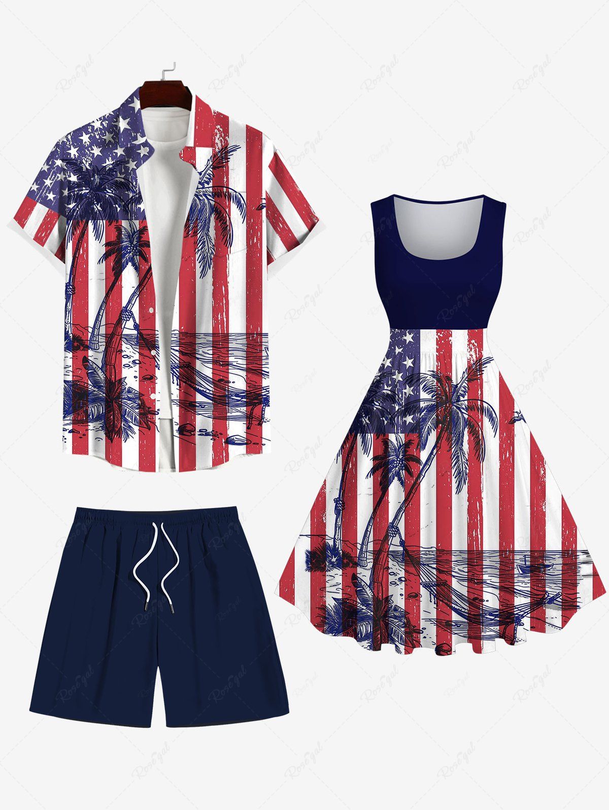 Coconut Tree Sea American Flag Striped Print Plus Size Matching Hawaii Beach Outfit For Couples