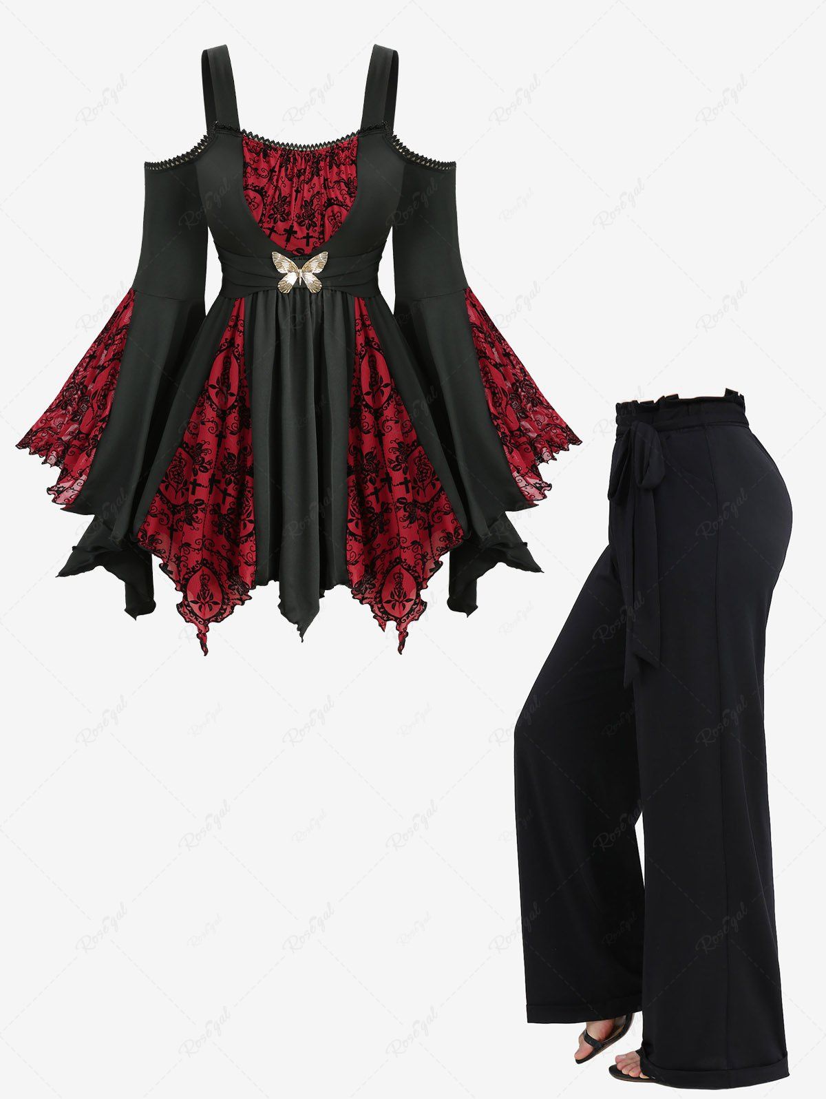 Gothic Flocking Mesh Lace Trim Cold Shoulder Flare Sleeves Top and Waist Ruffles Wide Leg Pants Plus Size Outfit