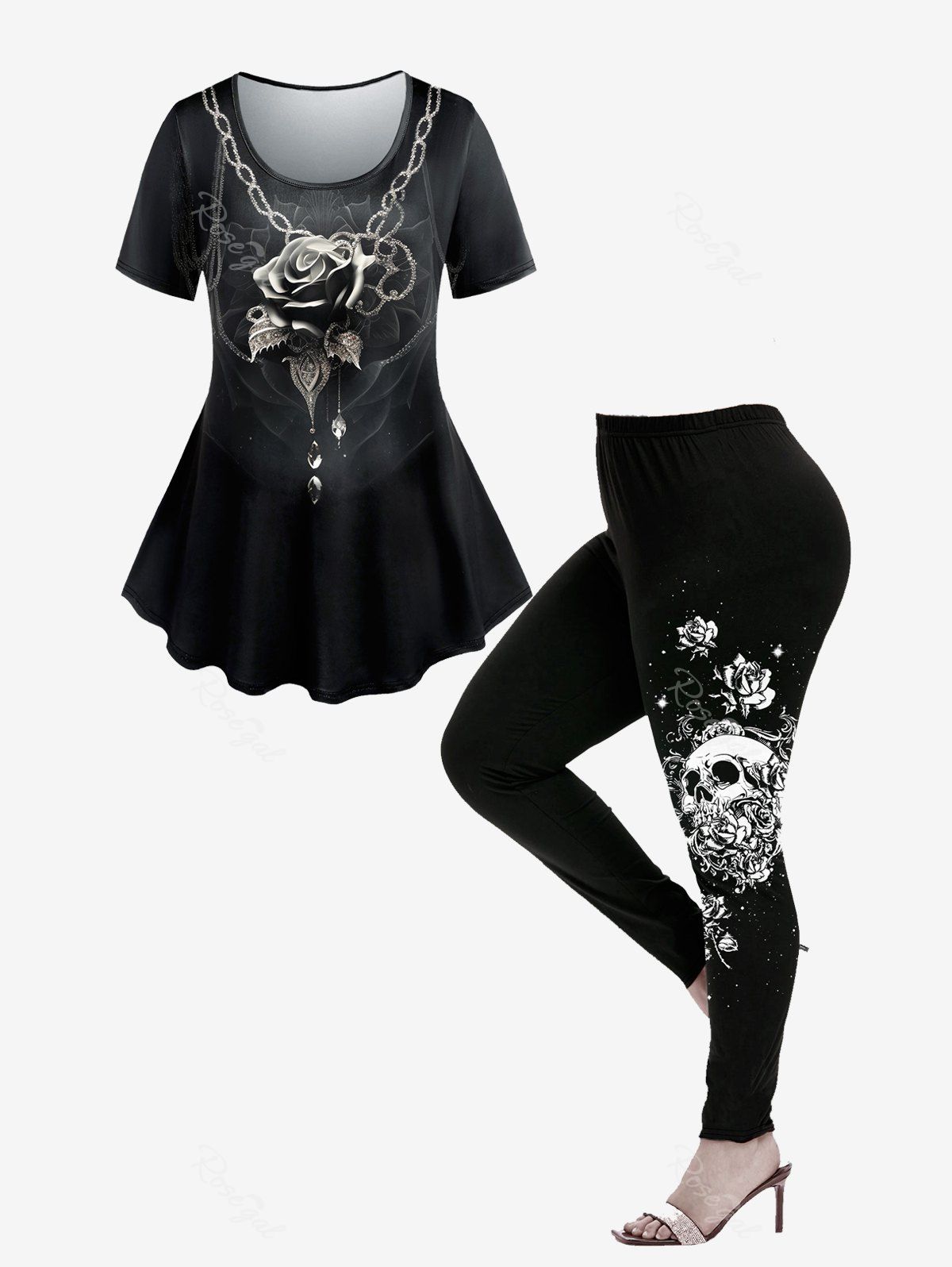 Gothic Rose Skull Print T-shirt and Rose Skull Print Skinny Leggings Outfit