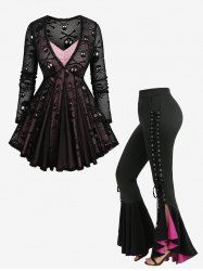 Gothic Bell Sleeve Skull Lace Handkerchief Tee and Lace Up Contrast Godet Hem Flare Pants Outfit