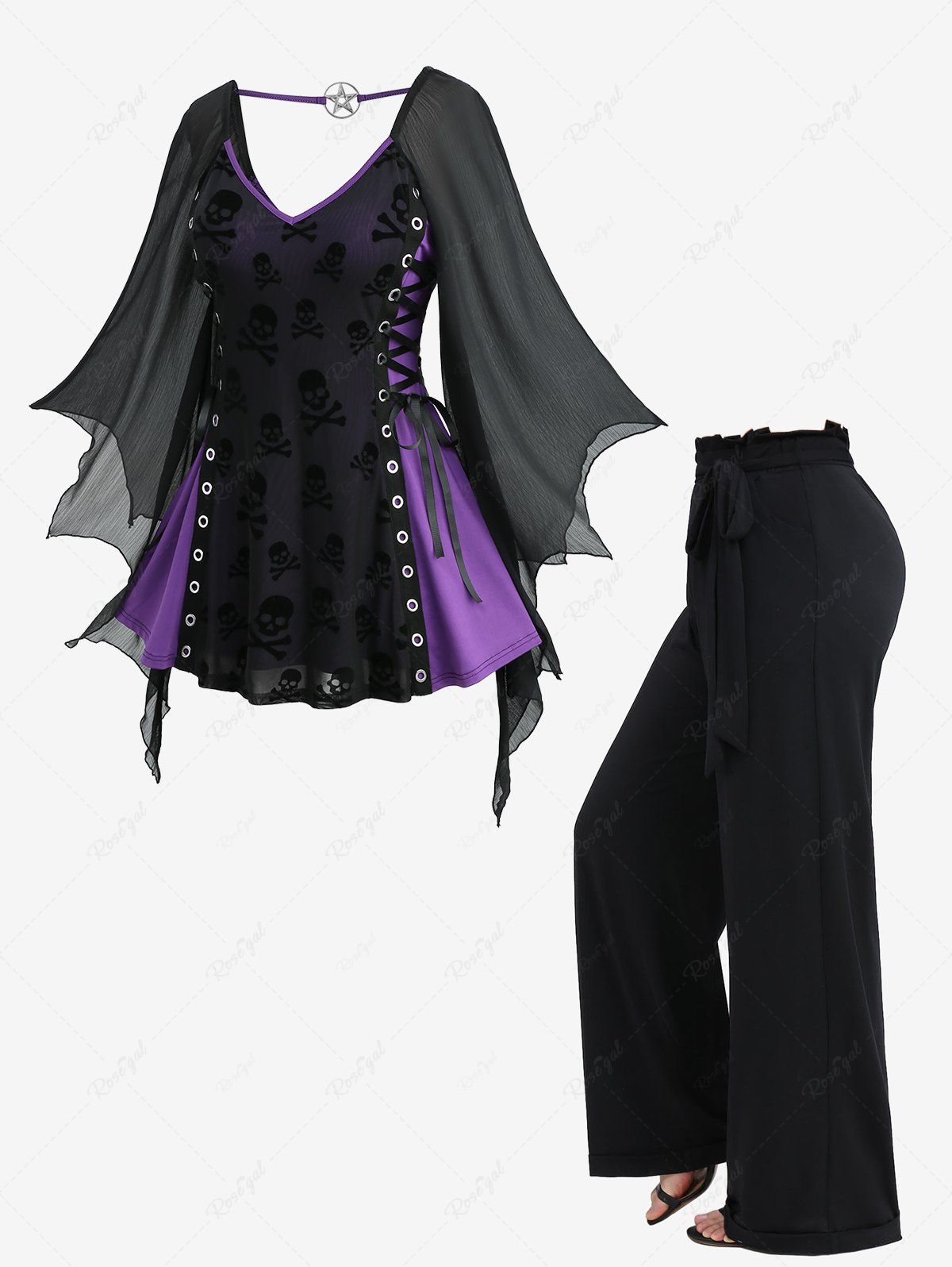 Gothic Bell Sleeve Skull Lace Handkerchief Tee and Lace Up Contrast Godet Hem Flare Pants Outfit