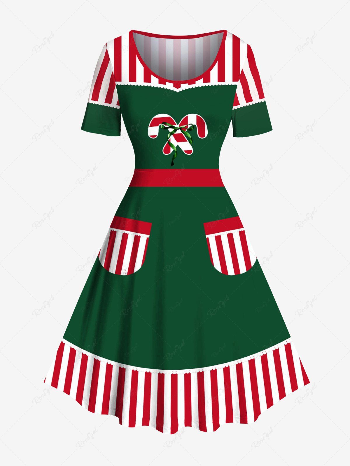 Plus Size Christmas Elf Candy Stripes Print Vintage Dress - 6x