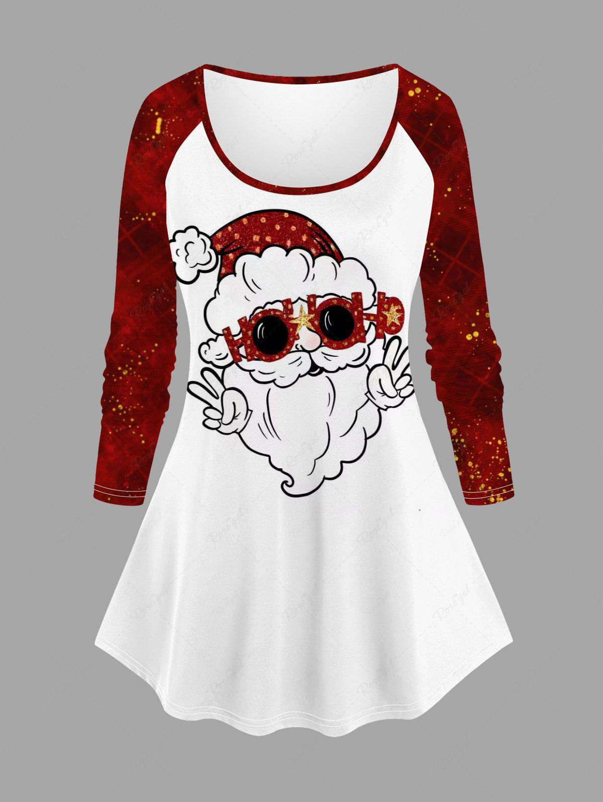 Plus Size Christmas Cute Santa Claus Print Ombre Plaid Raglan Sleeves T-shirt - 6x