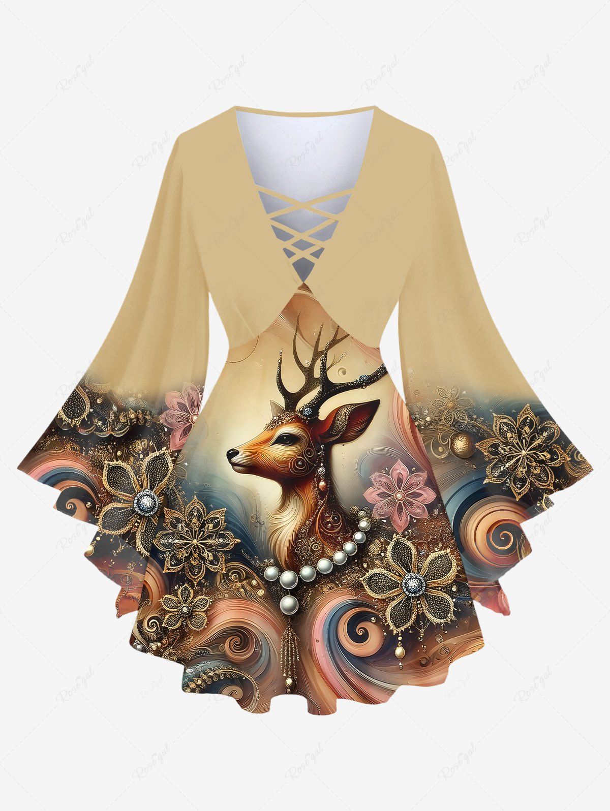 Plus Size Christmas Elk Flowers Waves Print Lattice Crisscross Flare Sleeves T-shirt - 4x