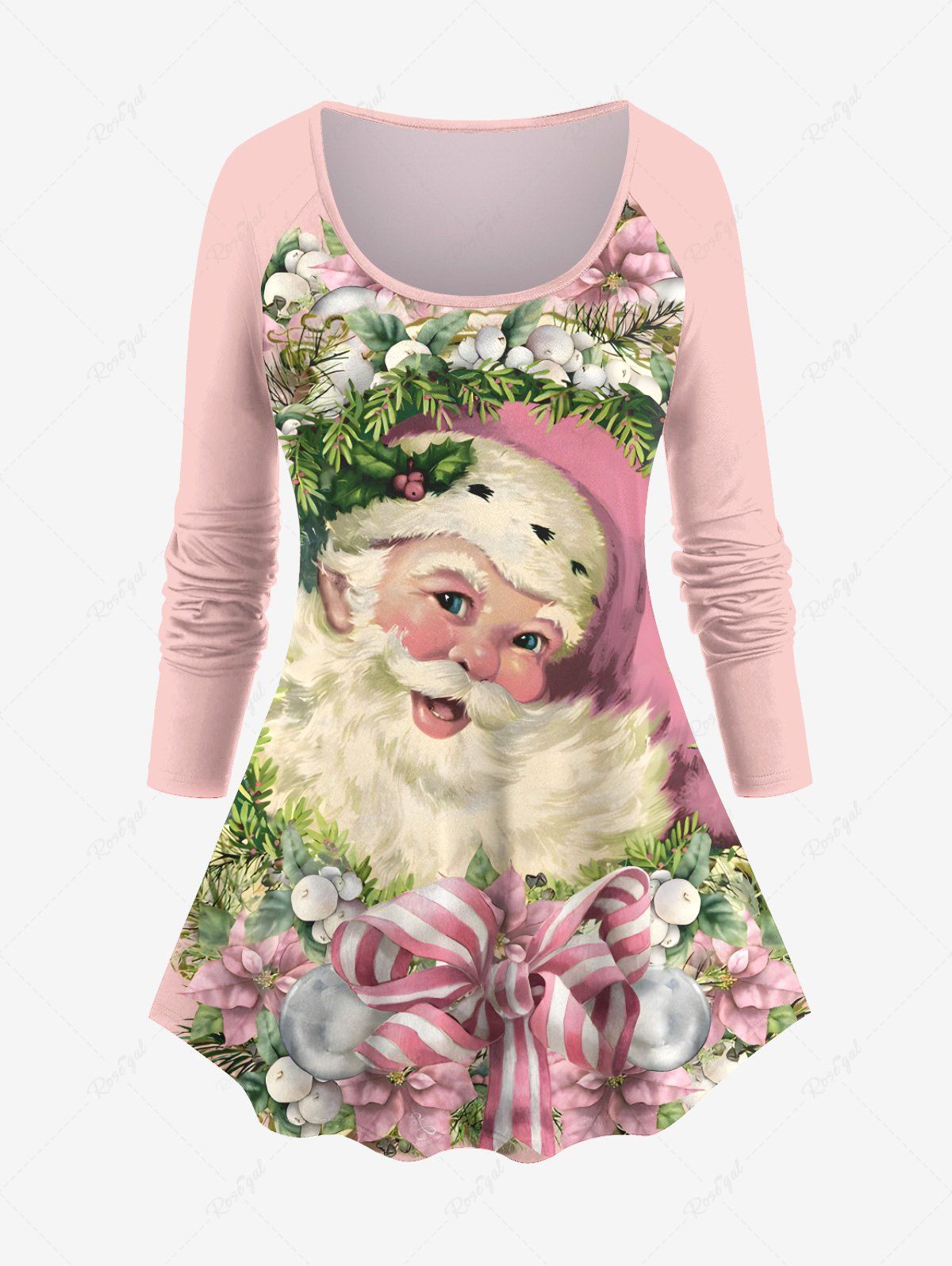 Plus Size Christmas Flower Leaf Santa Claus Bowknot Print Raglan Sleeve T-shirt - L
