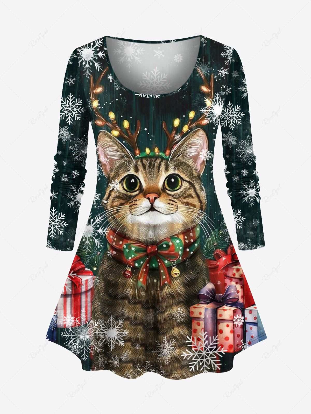 Plus Size Christmas Snowflake Gift Cat Elk Print Long Sleeves Women T-shirt - 3x