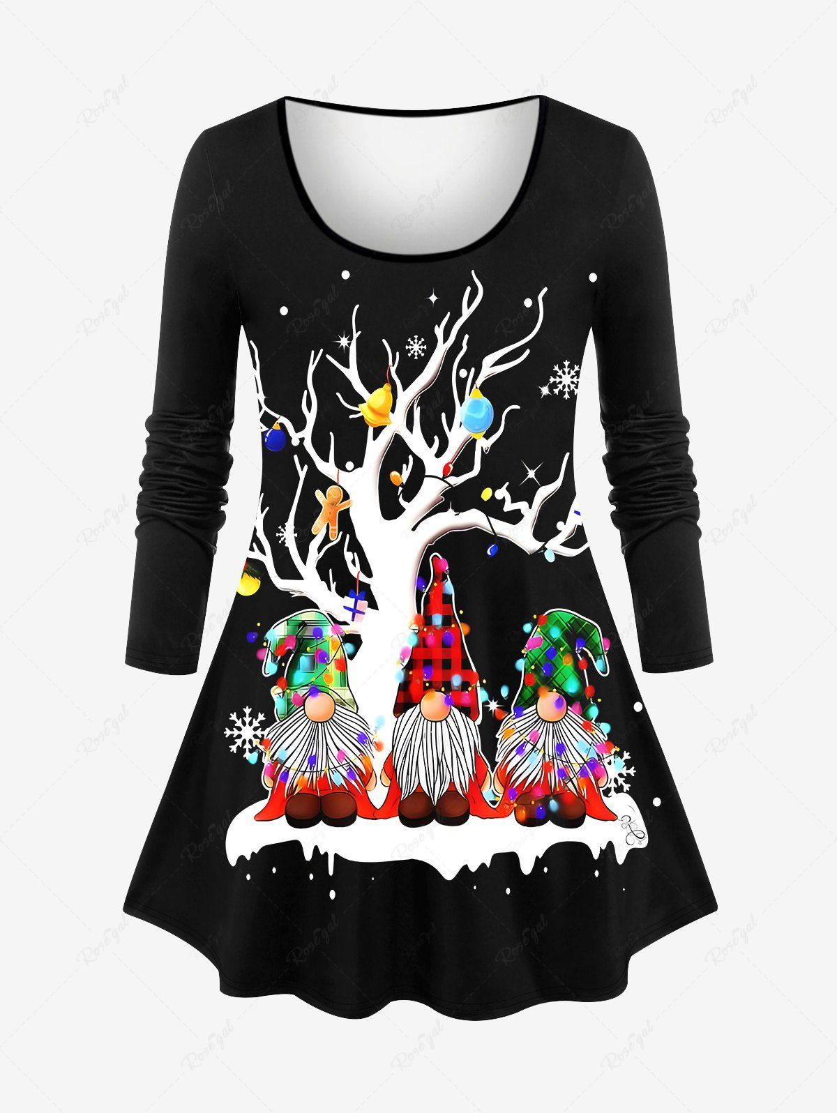 Plus Size Christmas Tree Ball Gingerbread Hat Dwarfs Snowflake Print Long Sleeves T-shirt - M
