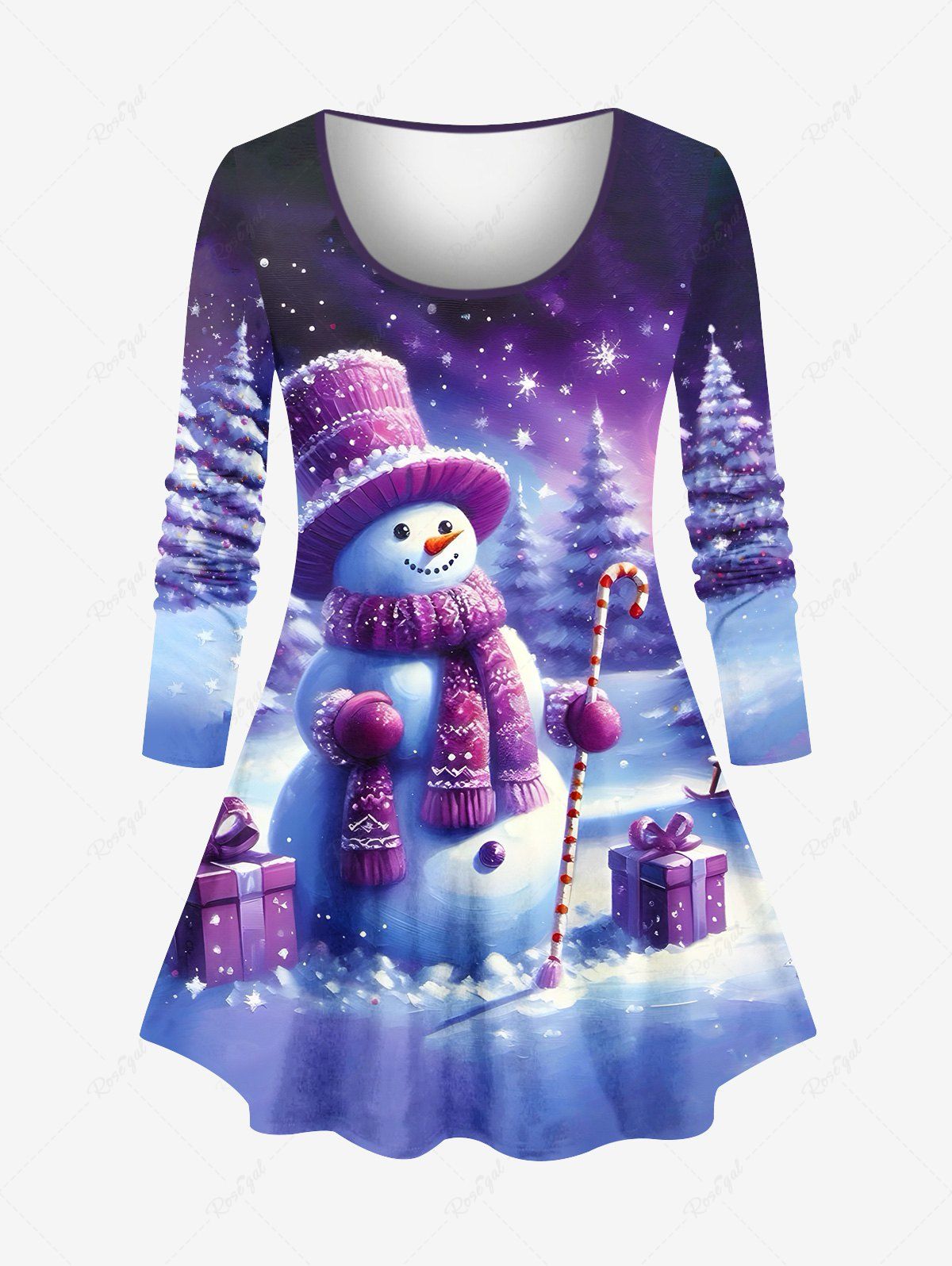 Plus Size Christmas Tree Snowman Snowflake Print Long Sleeves T-shirt - 2x