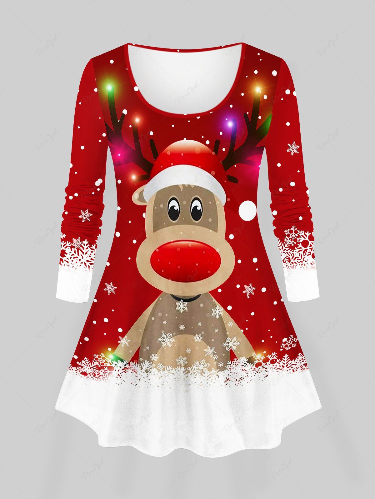 Plus Size Women's Christmas Elk Snowflake Colorblock Print Long Sleeves T-shirt - M