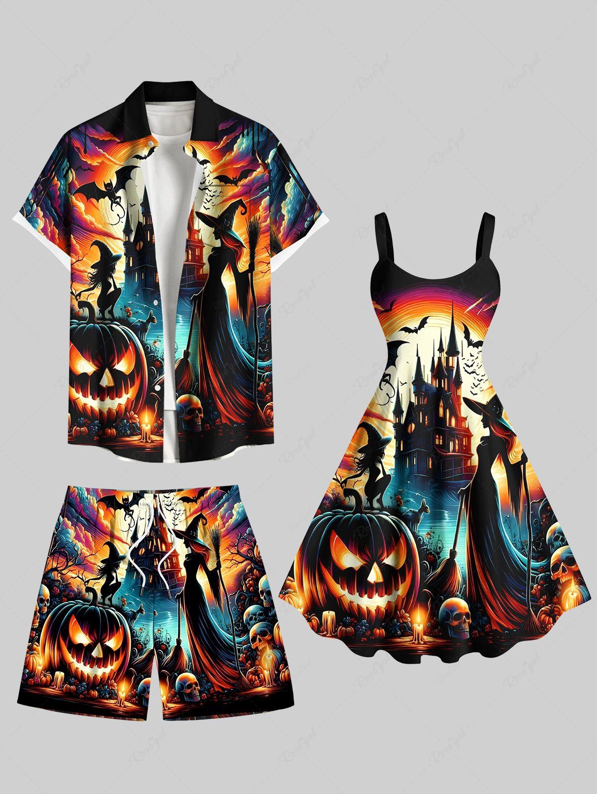 Halloween Pumpkin Lantern Skull Wizard Bat Castle Moon Print Plus Size Matching Outfit For Couples