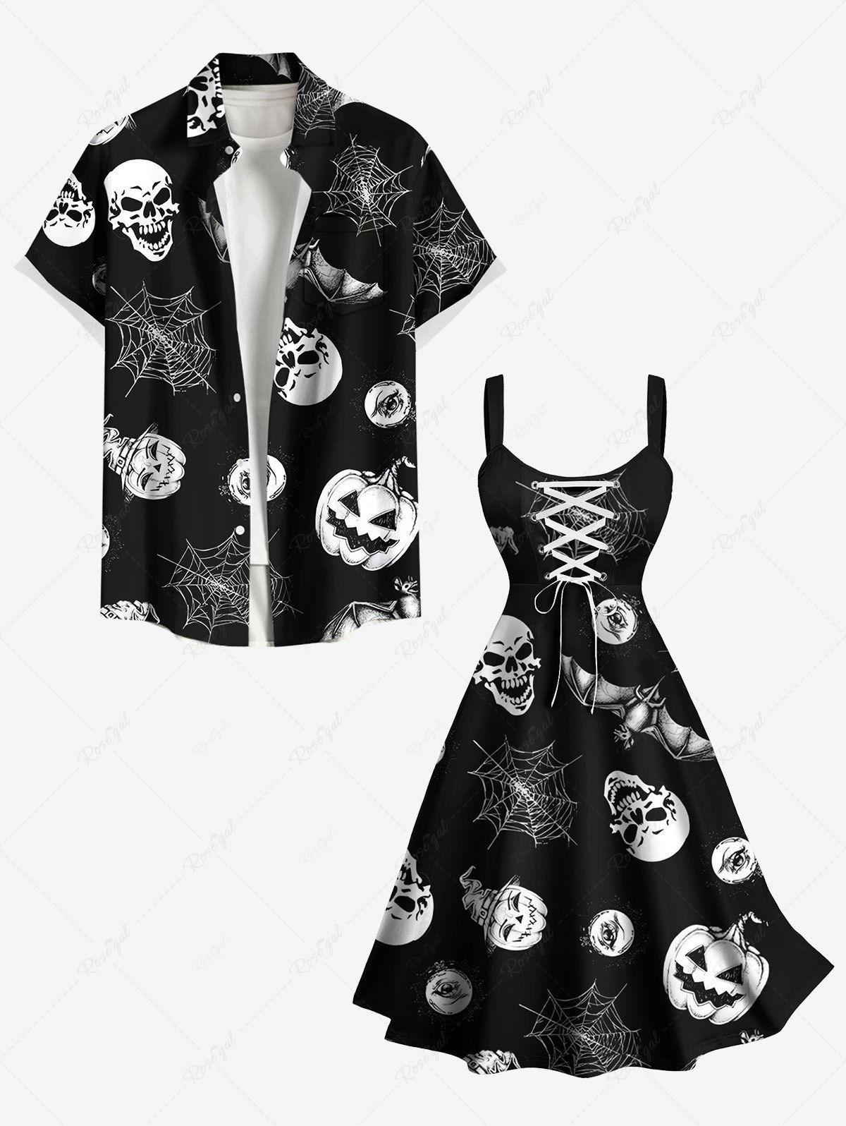 Halloween Pumpkin Skull Spider Web Bat Print Plus Size Matching Outfit For Couples