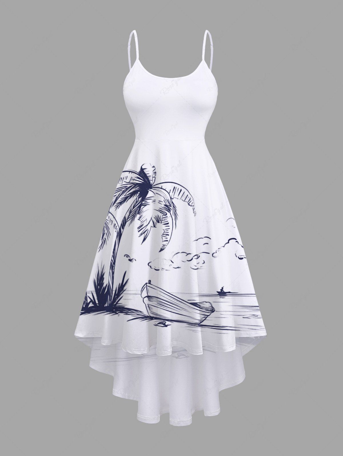 Plus Size Coconut Tree Boat Seascape Print High Low Hawaii Cami Dress - L
