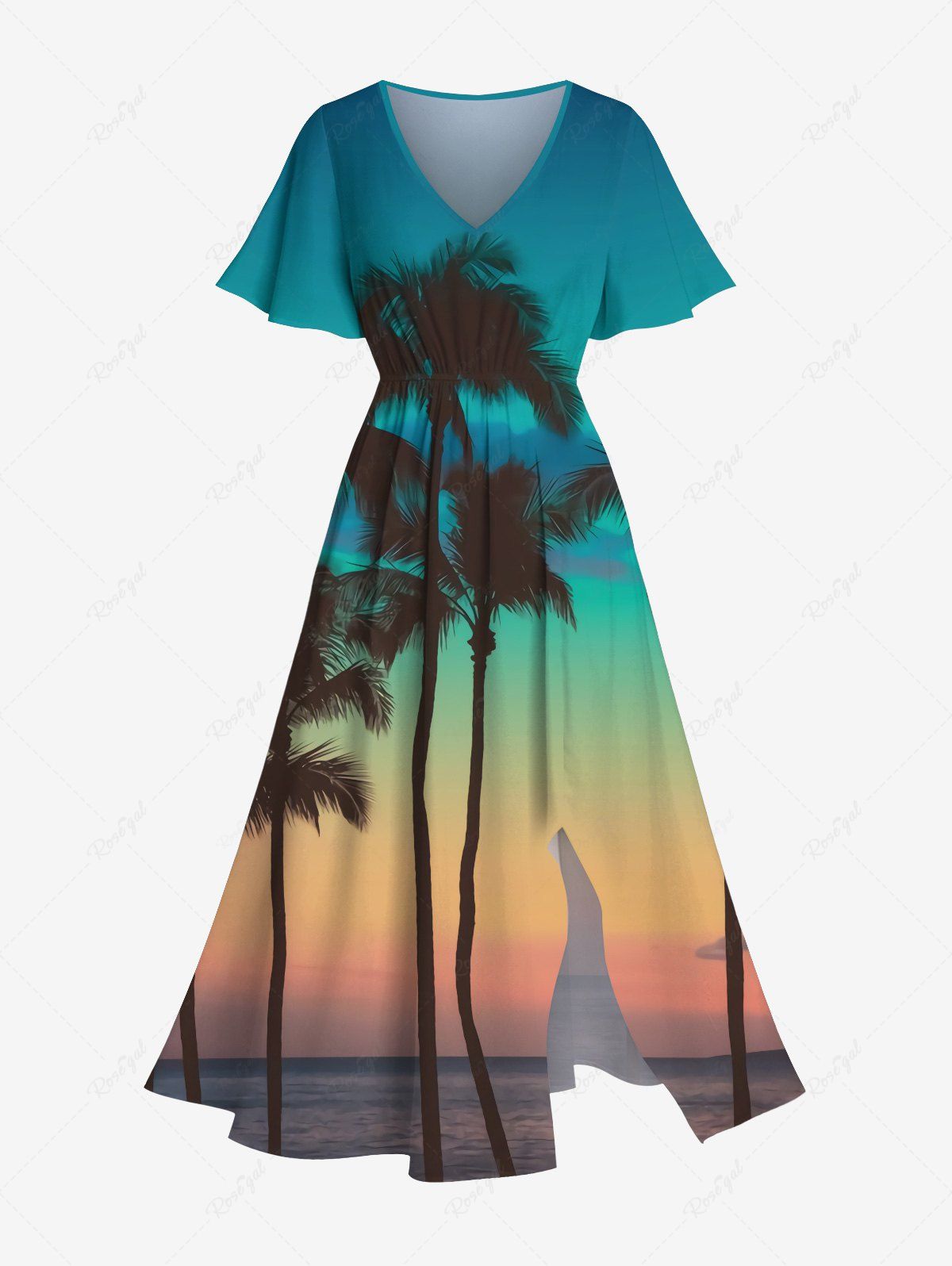 Plus Size Coconut Tree Sea Ombre Dusk Sky Print Hawaii Split Pocket A Line Midi Dress - S