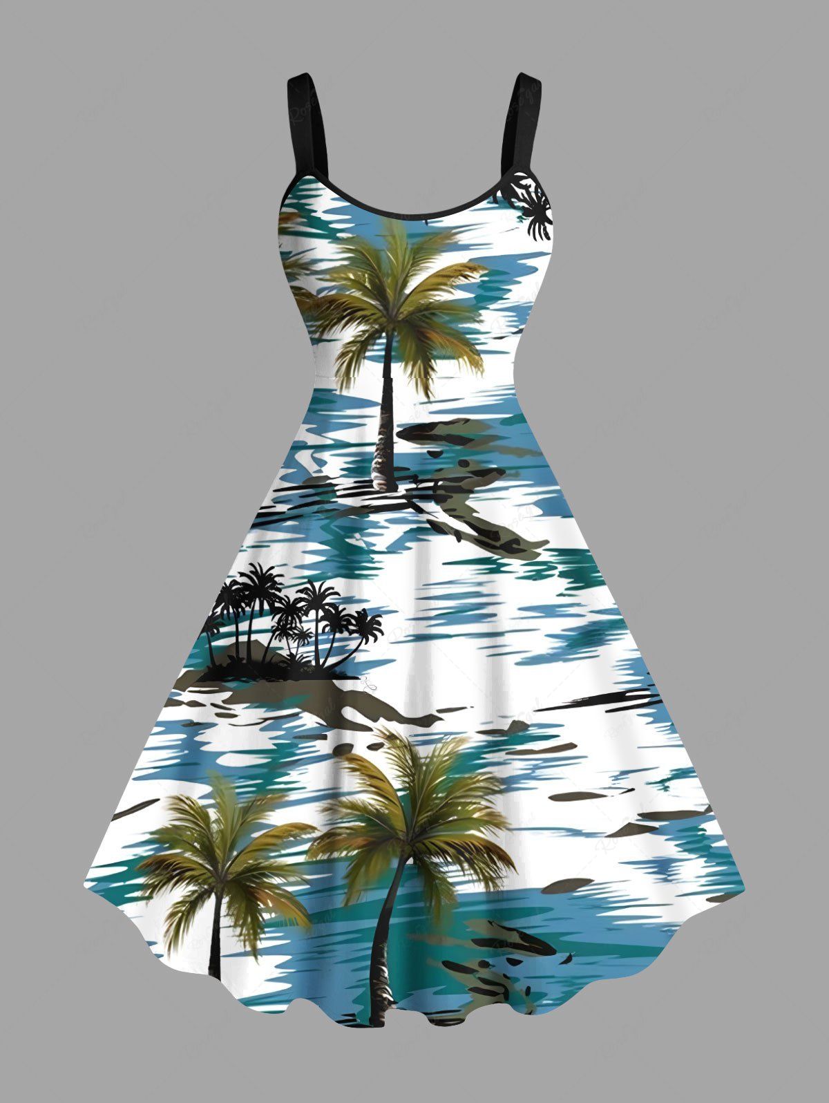 Plus Size Coconut Tree Sea Sailboat Print Hawaii A Line Tank Dress - M