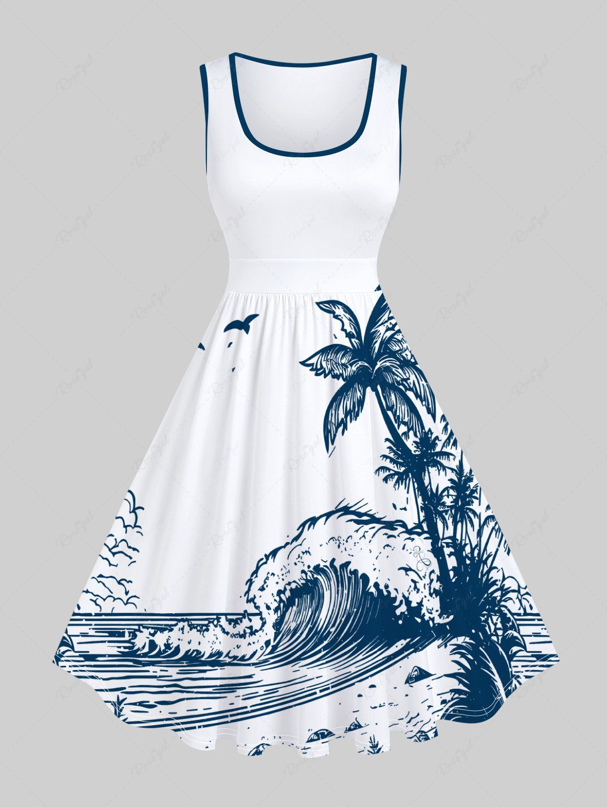 Plus Size Coconut Tree Sea Wave Beach Bird Print Hawaii Vintage Swing A Line Dress - Xxs
