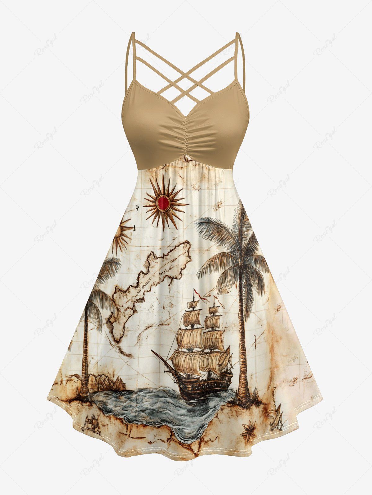 Plus Size Coconut Tree Sun Map Ship Cruise Print Ruched Lattice Crisscross Straps Hawaii Dress - 5x