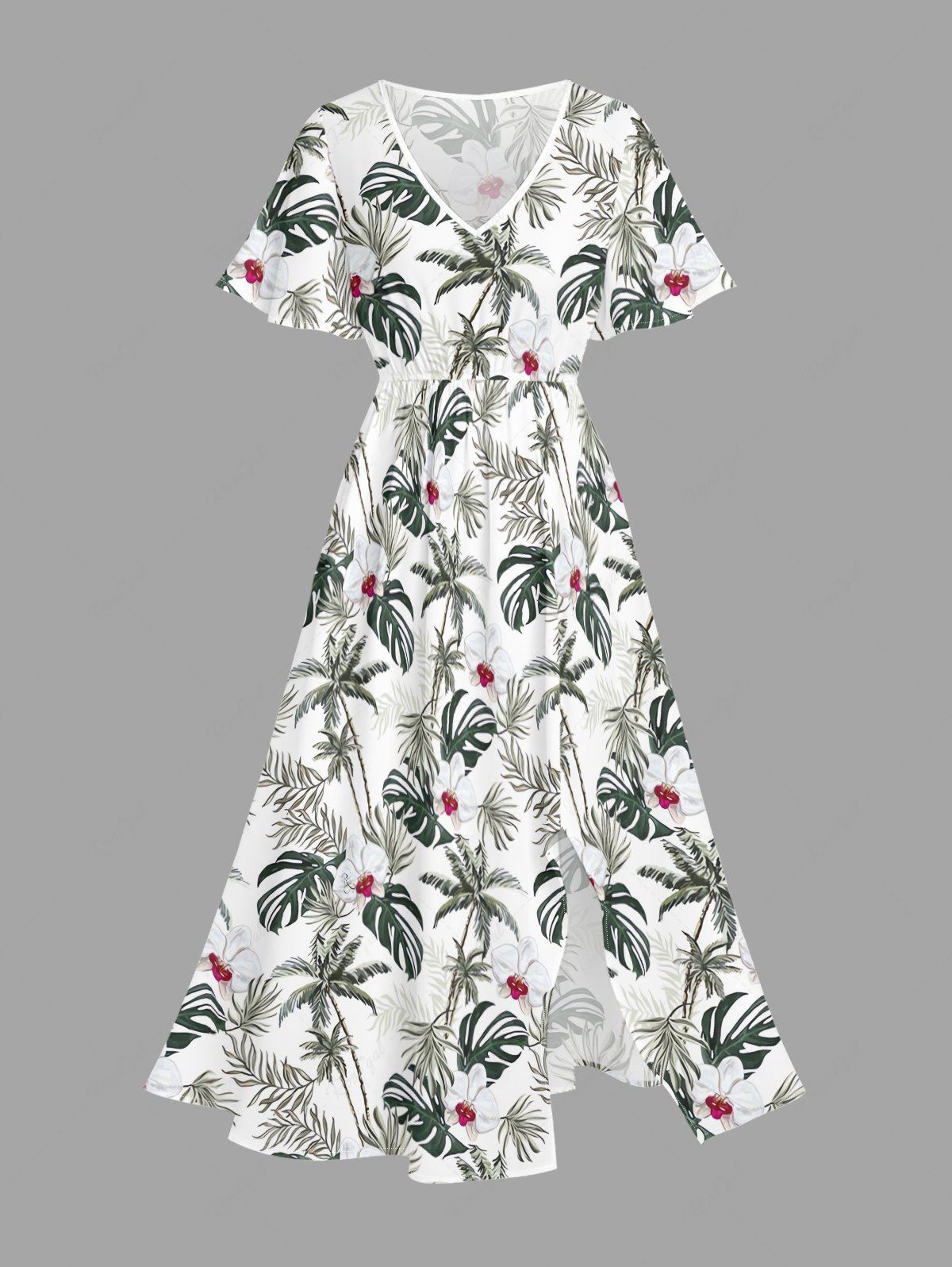 Plus Size Coconut Tree Tropical Flower Leaf Print Split Hawaii Midi Dress - L