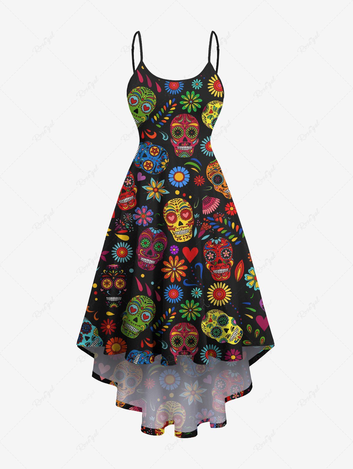 Plus Size Floral Skulls Heart Print High Low Hawaii Cami Dress - 2x