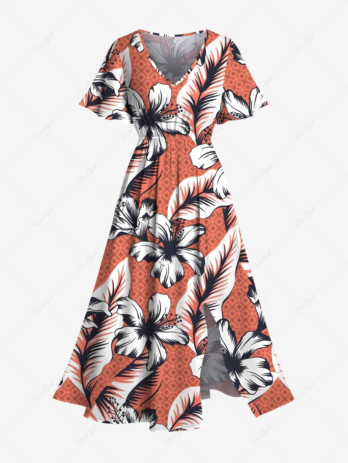 Plus Size Floral Tropical Leaves Print Hawaii Split Pocket A Line Midi Dress - 4x