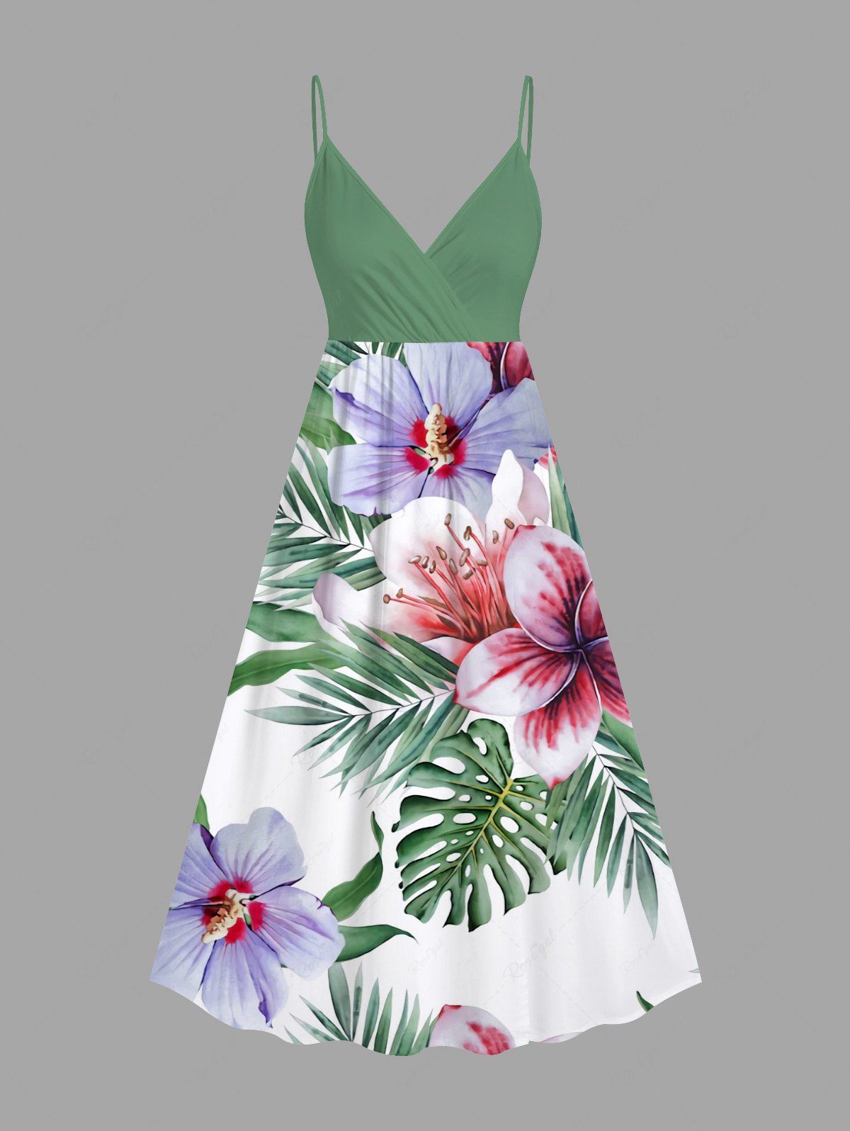Plus Size Flowers Tropical Leaf Print Surplice Hawaii Cami Dress - Xs