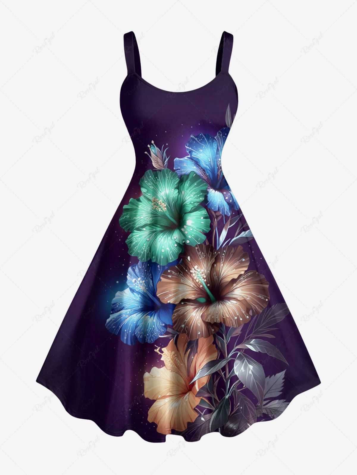 Plus Size Glitter Hibiscus Flower Print Hawaii A Line Dress - 3x