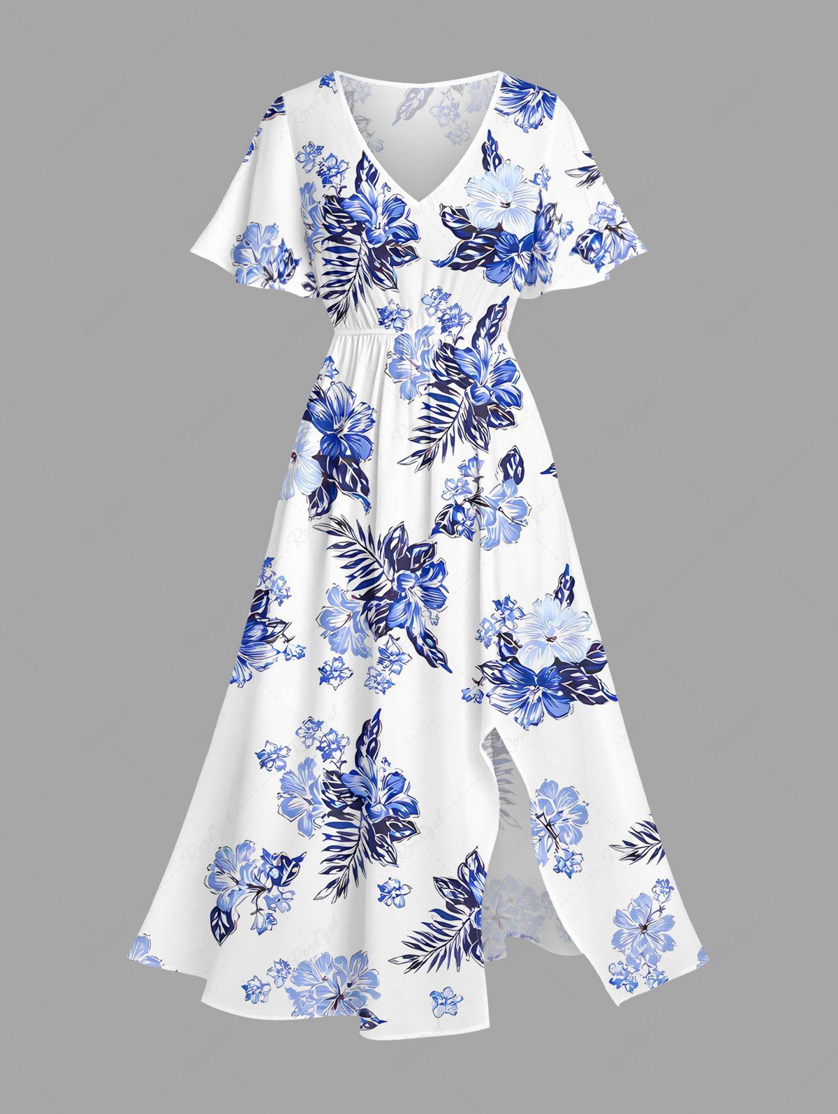 Plus Size Hibiscus Flower Leaf Print Split Hawaii Midi Dress - M