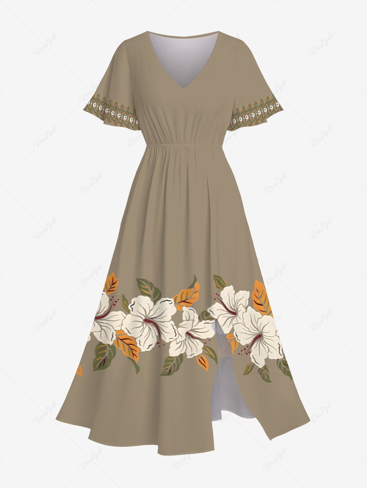 Plus Size Hibiscus Flower Leaf Print Split Hawaii Midi Dress - 3x