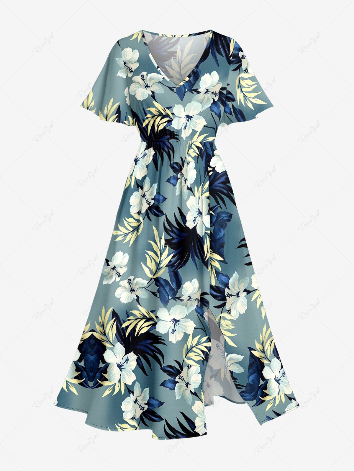 Plus Size Hibiscus Flower Tropical Leaf Print Split Hawaii Midi Dress - 1x