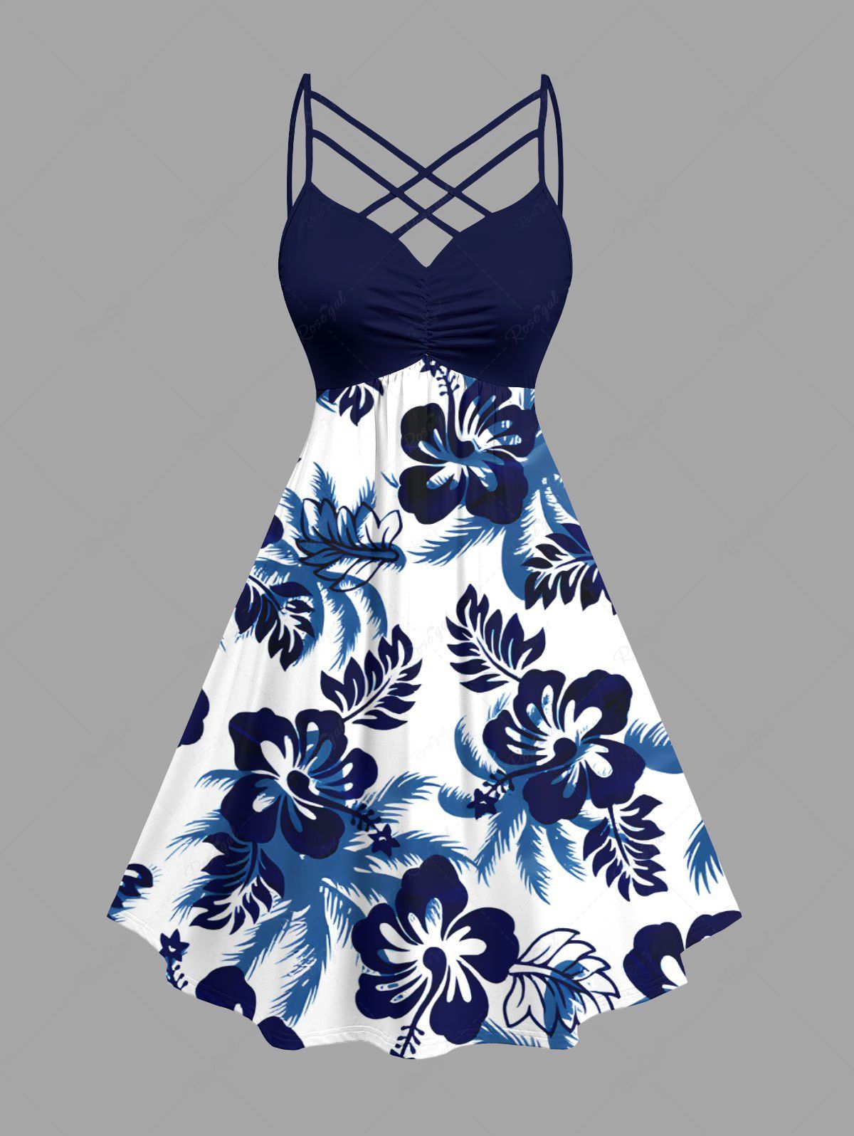 Plus Size Hibiscus Flowers Leaf Print Ruched Lattice Crisscross Straps Hawaii Dress - M