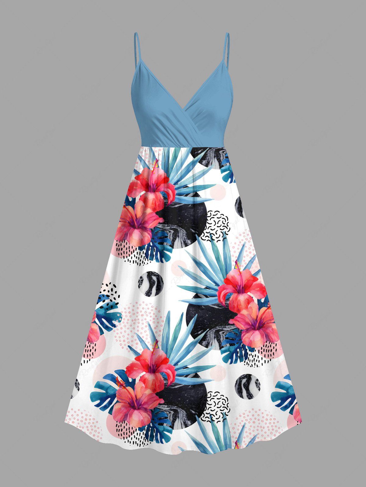 Plus Size Hibiscus Flowers Tropical Leaf Geometrical Circle Print Surplice Hawaii Cami Dress - Xxs