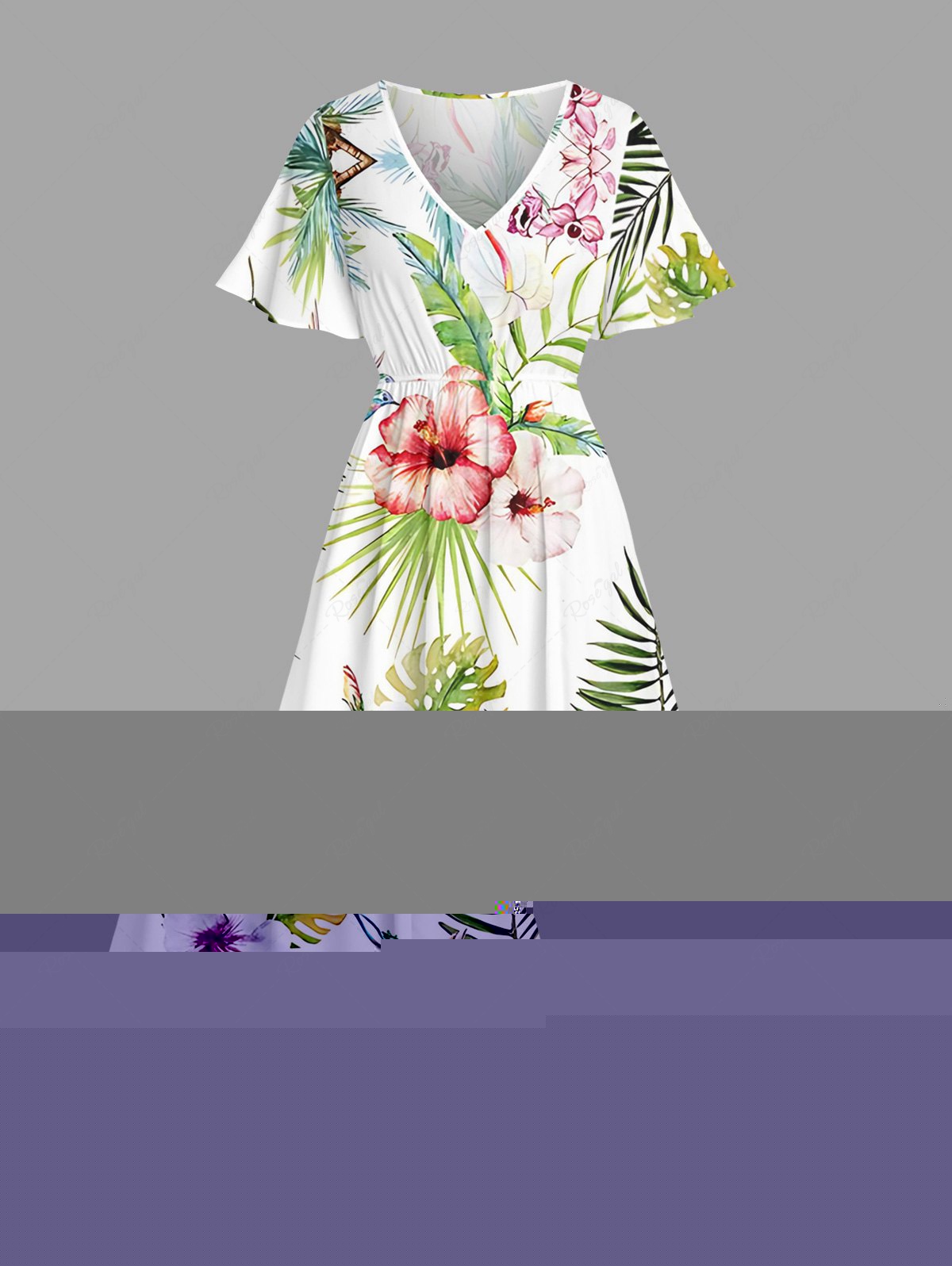 Plus Size Hibiscus Flowers Tropical Leaf Pineapple Bird Print Split Hawaii Midi Dress - 1x