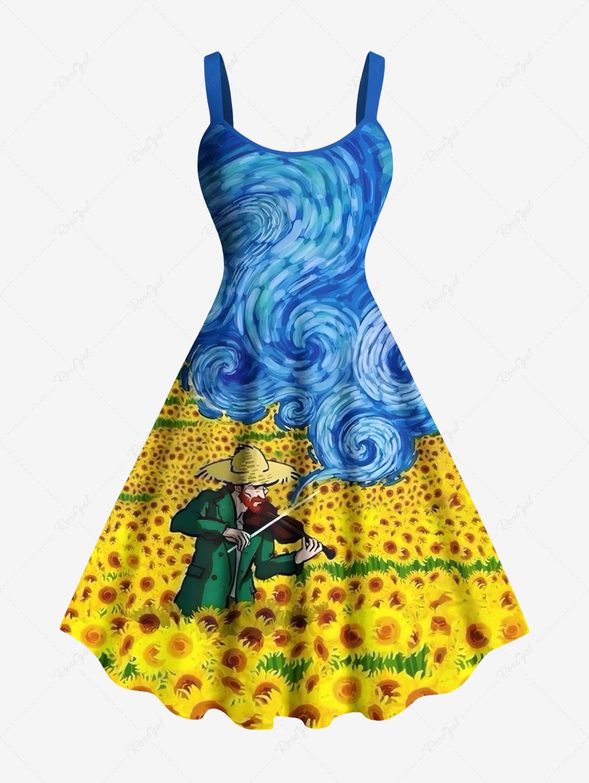 Plus Size Oil Painting Swirls Musician Sunflowers Print Hawaii Tank Dress - 4x