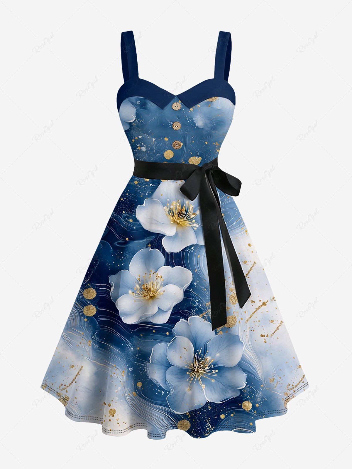 Plus Size Ombre Flower Galaxy Print Hawaii Button A Line Dress with Removable Belt - 5x