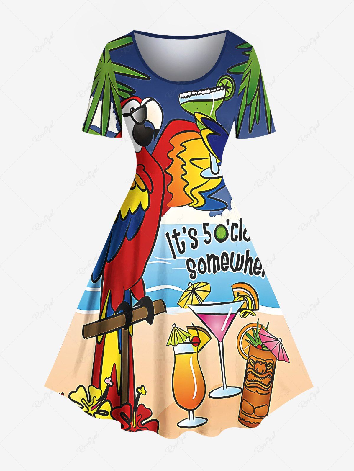 Plus Size Parrot Fruit Juice Coconut Tree Cloud Seascape Print Hawaii Vintage Dress - M