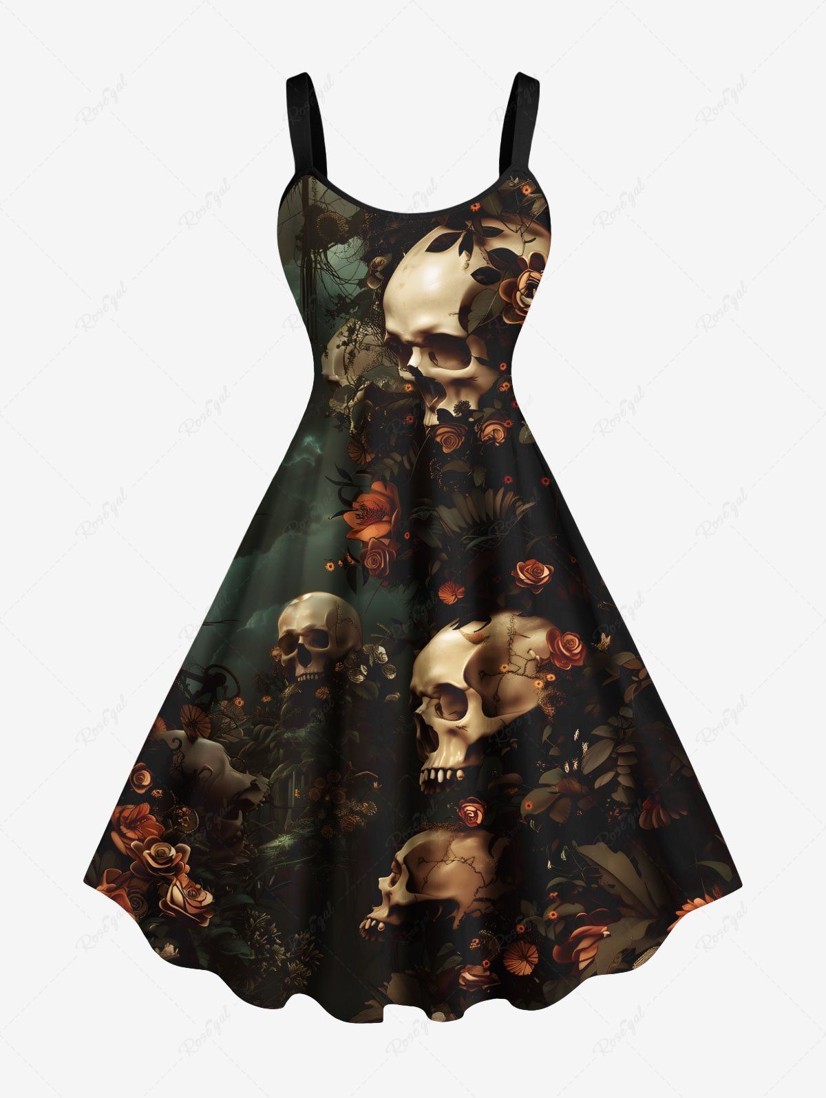 • Plus Size Skulls Rose Flower Cloud Print Hawaii Tank Dress Size: 2X Color: DEEP GREEN