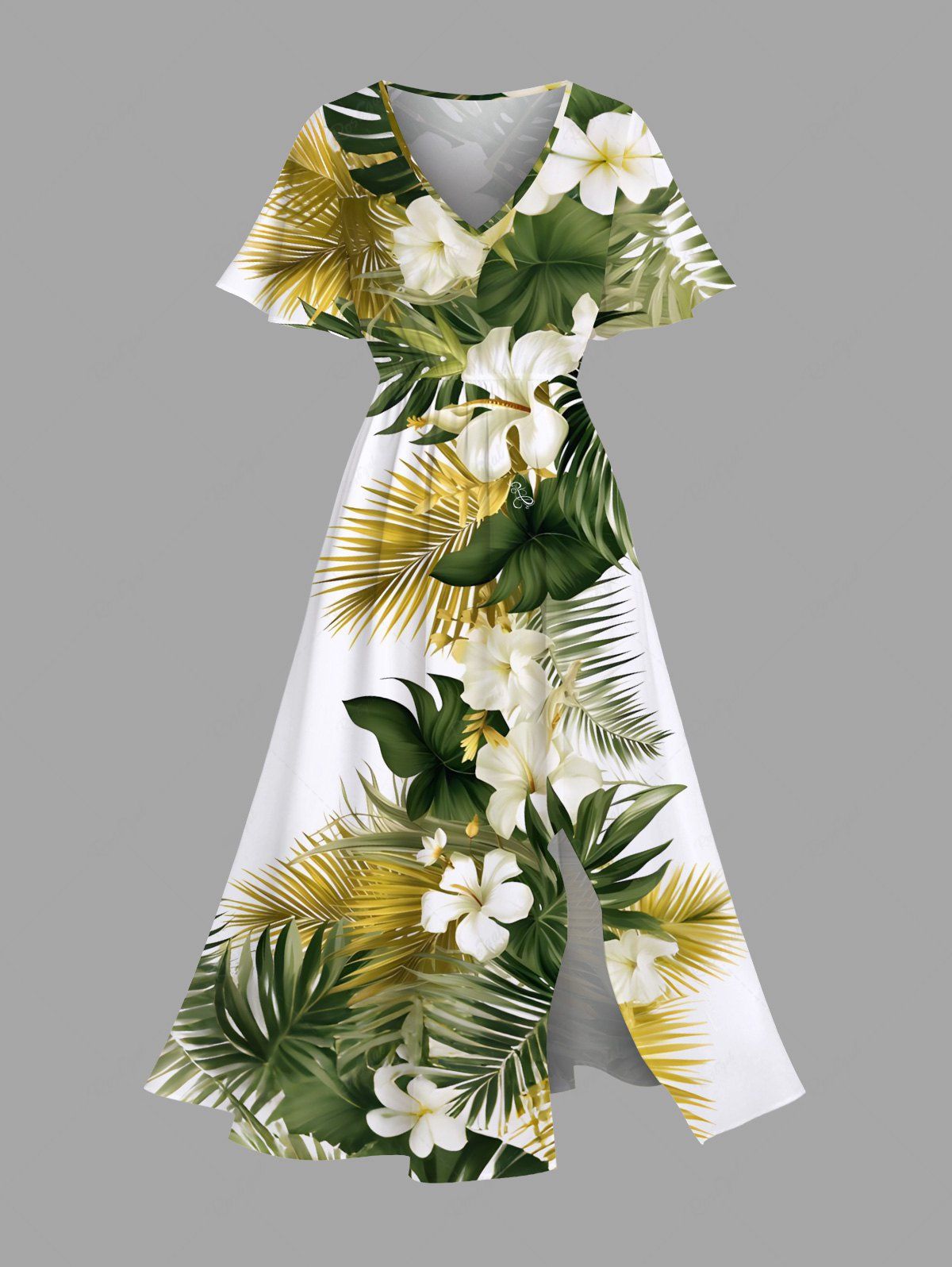 Plus Size Tropical Leaf Hibiscus Flowers Print Split Hawaii Midi Dress - Xs