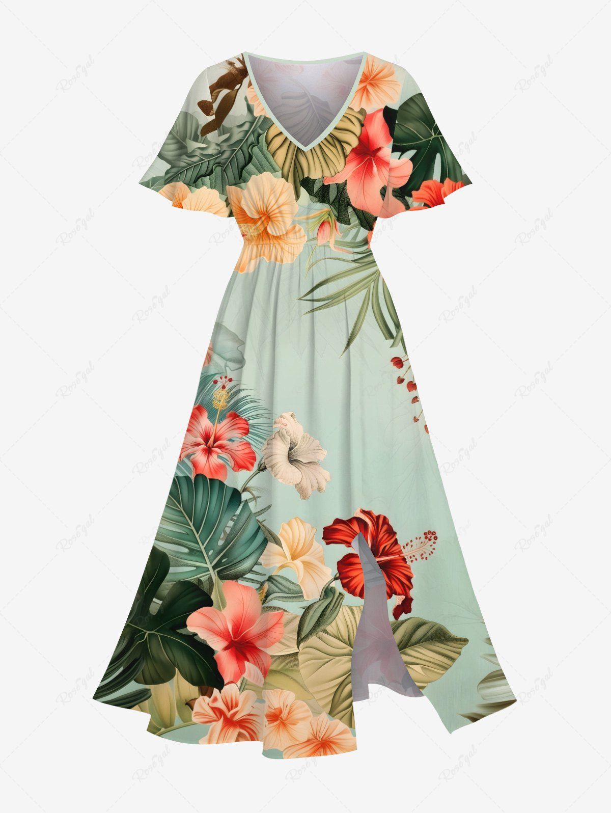 Plus Size Tropical Leaf Hibiscus Flowers Print Split Hawaii Midi Dress - 2x