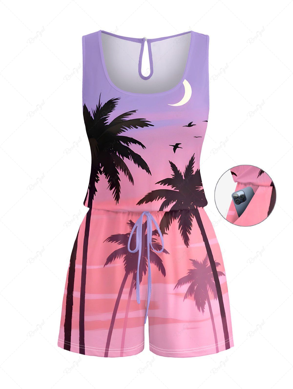 Plus Size Coconut Tree Bird Moon Ombre Print Cinched Hawaii Romper - Xxs