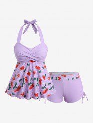 Halter Twist Flower Print Cinched Boyleg Tankini Swimsuit