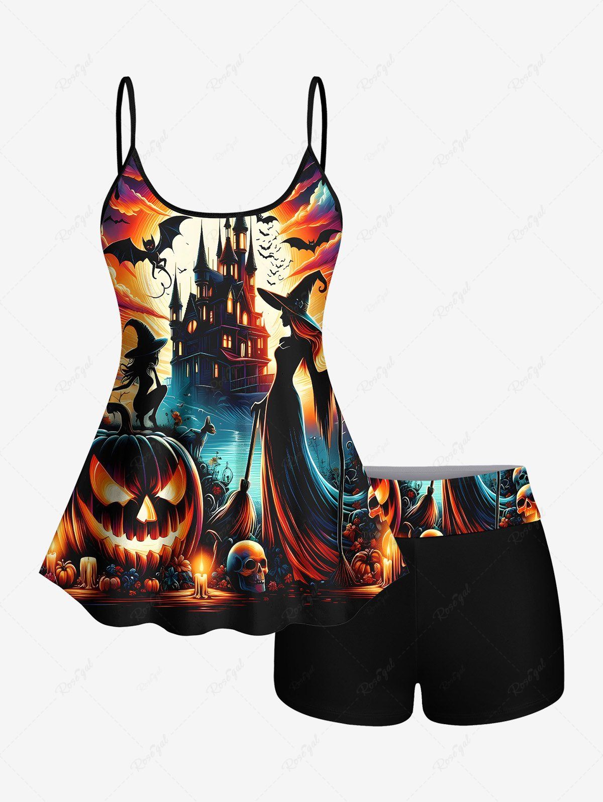Skull Pumpkin Wizard Bat Castle Print Halloween Boyleg Tankini Swimsuit (Adjustable Shoulder Strap) - 6x