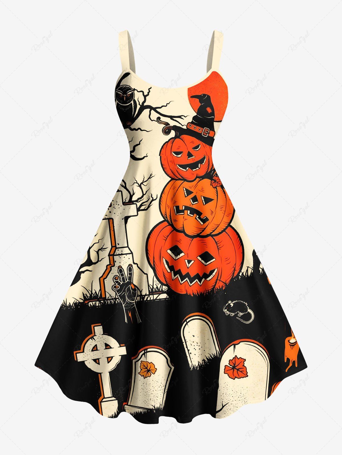 Plus Size Halloween Costume Pumpkin Cross Owl Tree Tombstone Print Tank Dress - 6x