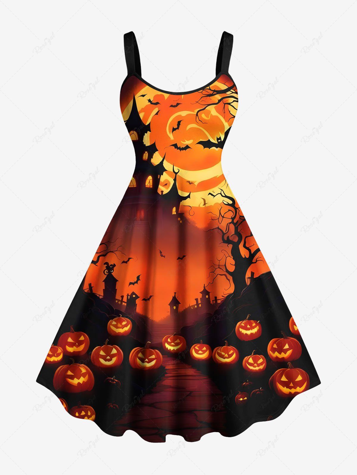 Plus Size Halloween Pumpkin Lantern Moon Bat Trees Print Tank Dress - 3x