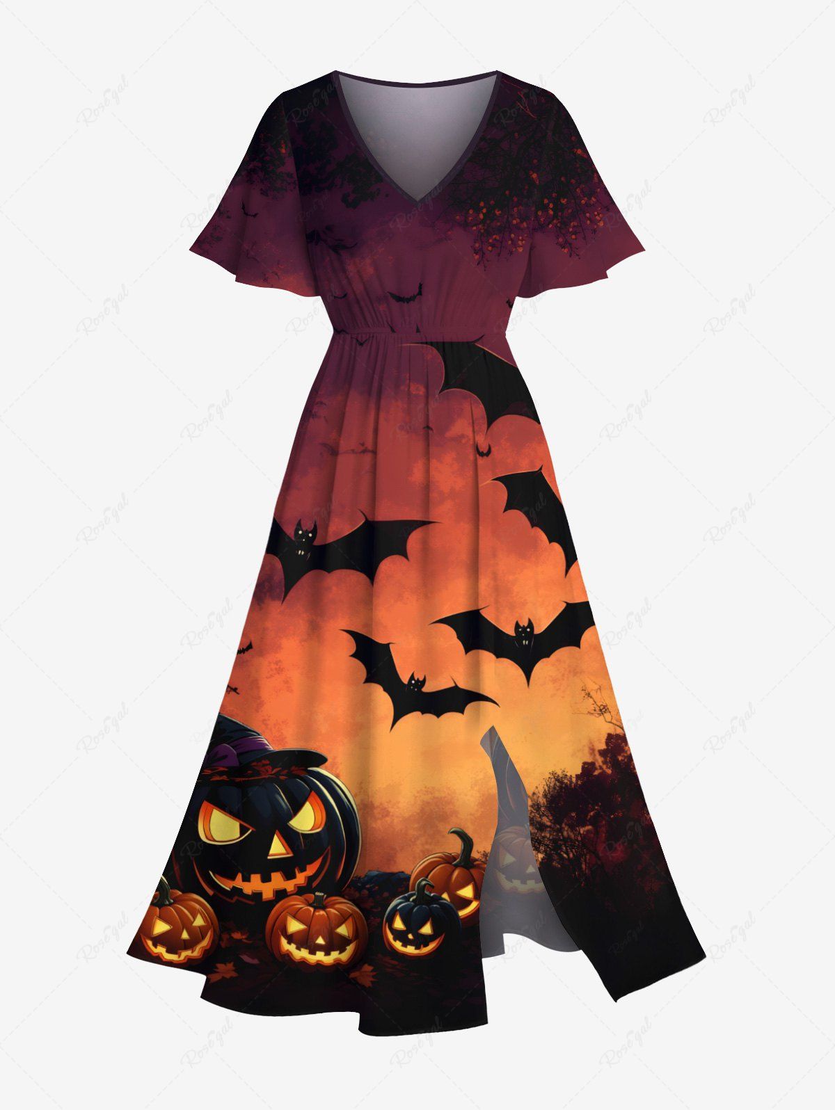 Plus Size Pumpkin Bat Ombre Galaxy Print Halloween Split Pocket A Line Midi Dress - 1x