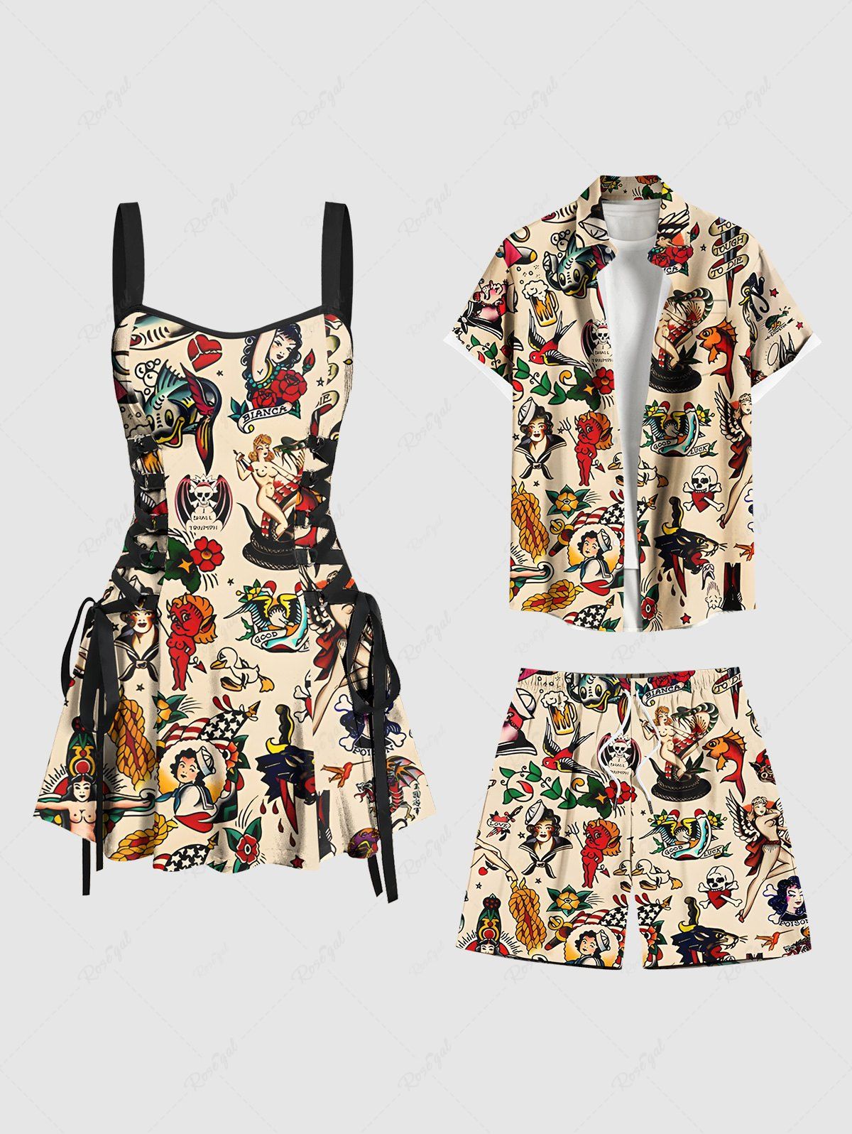 Skull Mermaid Fish Sailboat Beer Print Plus Size Matching Hawaii Beach Outfit For Couples