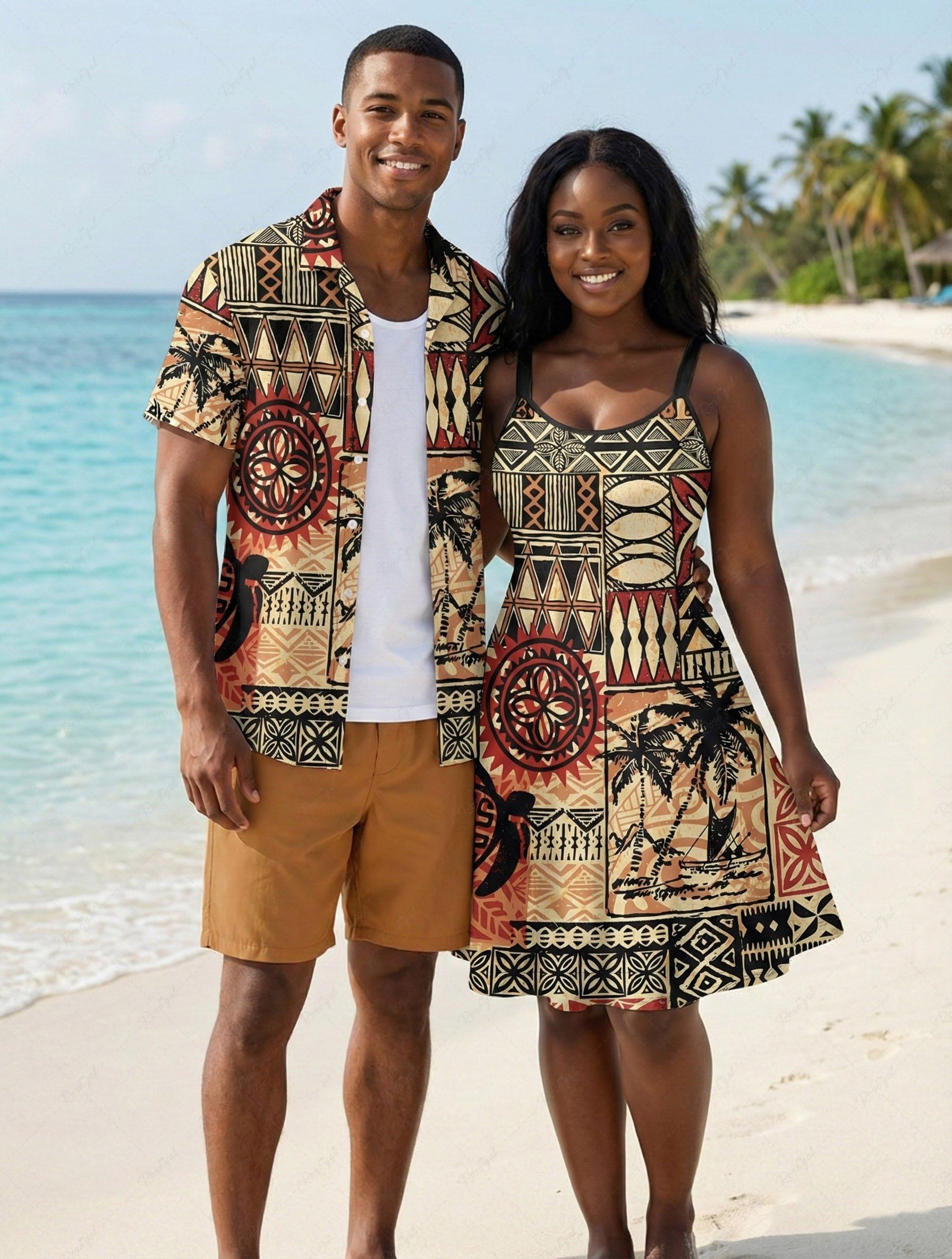 African Printed Matching Couple Outfit Coconut Tree Seascape Geometric Pattern Hawaiian Set
