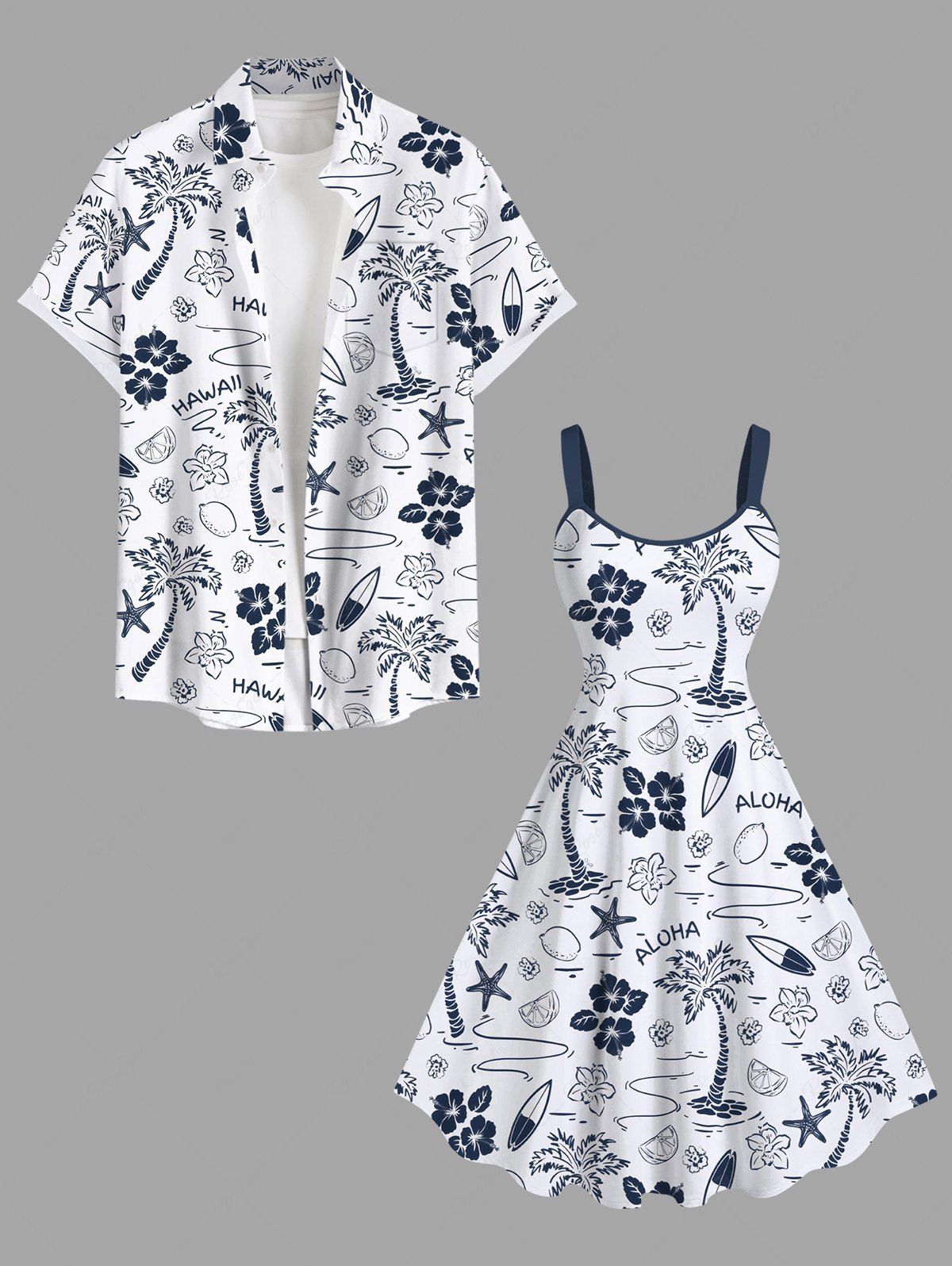 Coconut Tree Flower Lemon Starfish Sailboat Print Plus Size Matching Hawaii Beach Outfit For Couples