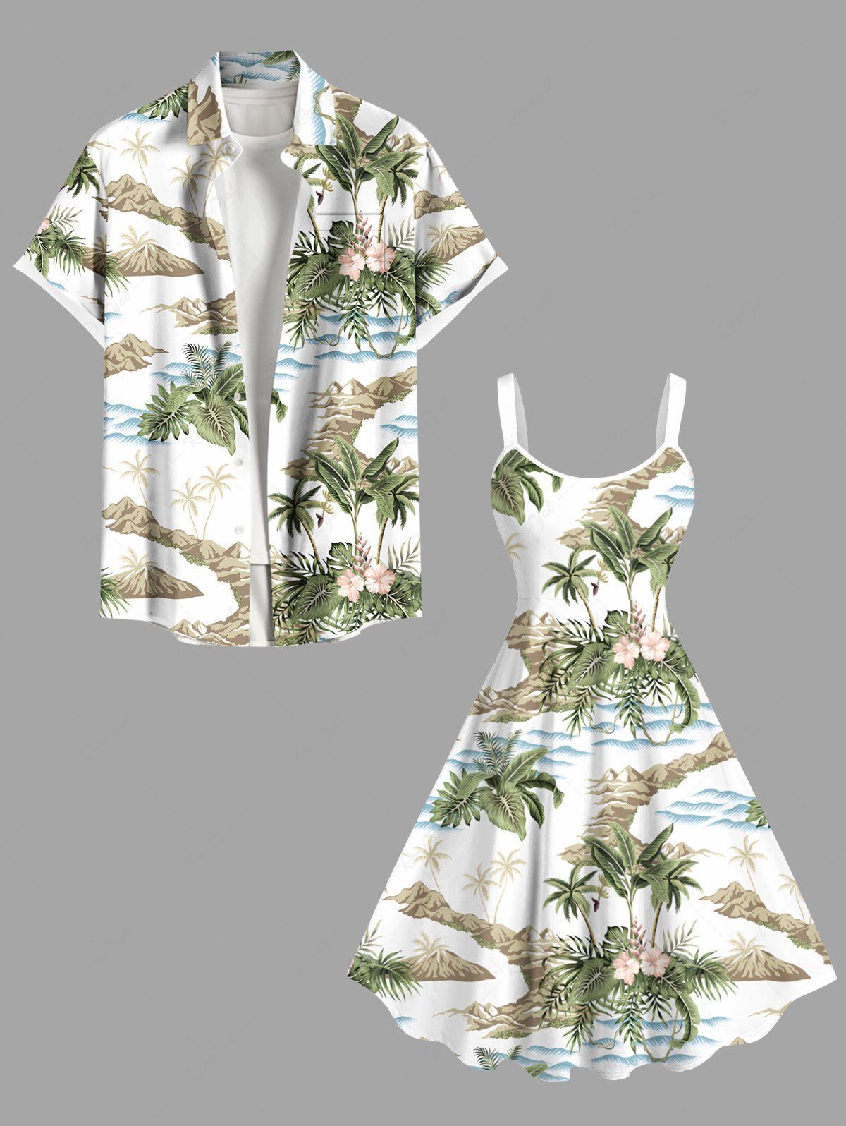 Coconut Tree Flowers Leaf Tropical Print Plus Size Matching Hawaii Beach Outfit For Couples