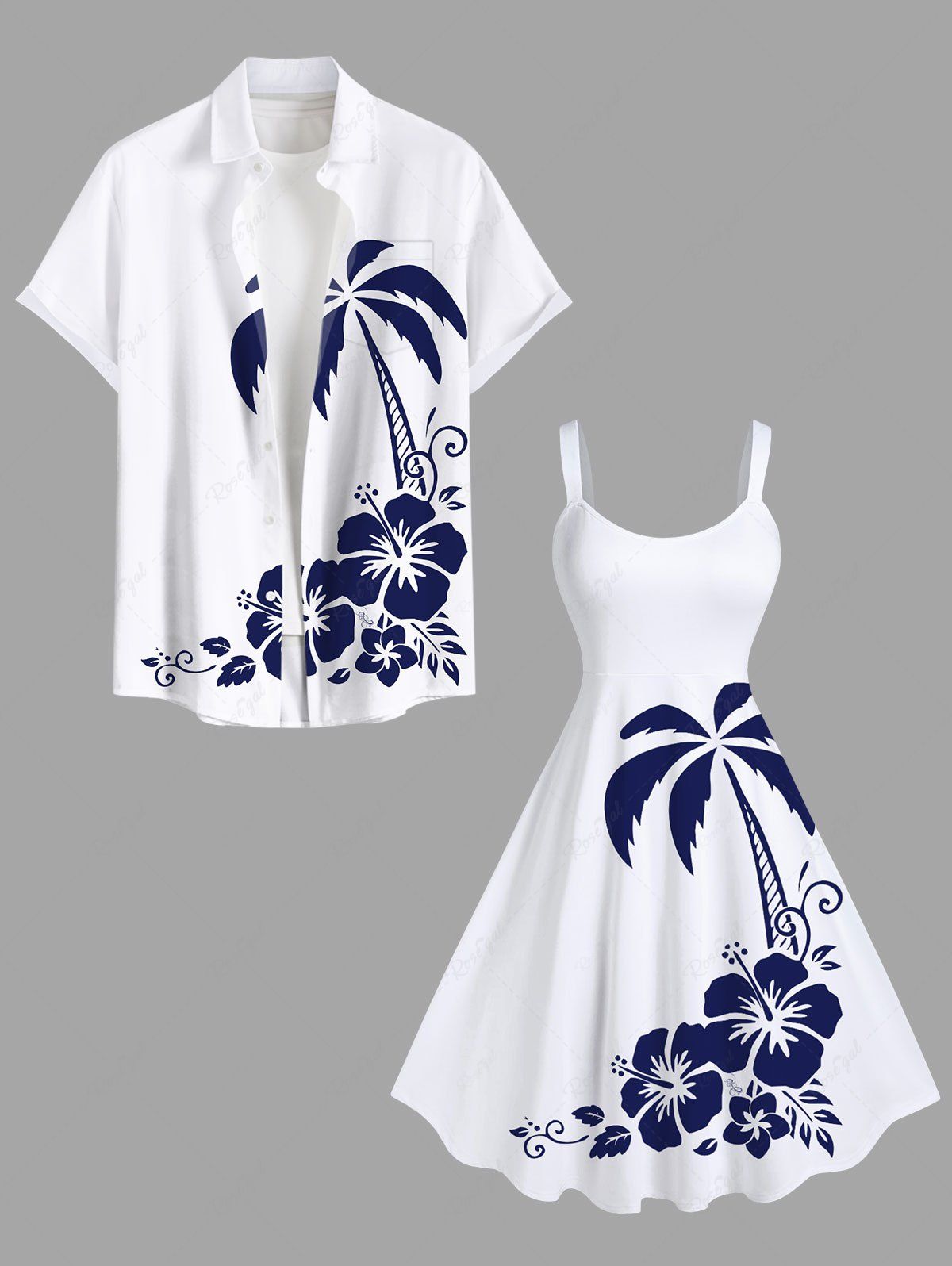 Coconut Tree Hibiscus Flower Two Tone Print Plus Size Matching Hawaii Beach Outfit For Couples