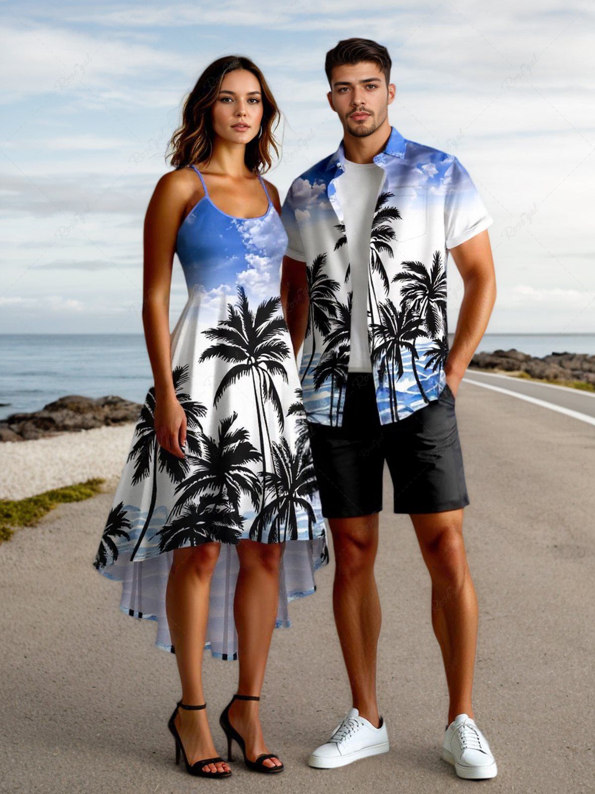 Coconut Tree Sea Waves Cloud Print Plus Size Matching Hawaii Beach Outfit For Couples