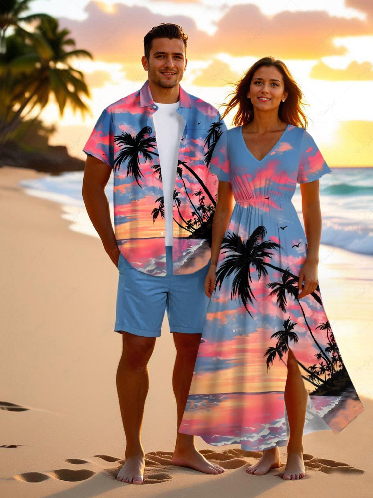Coconut Tree Seascape Ombre Sky Cloud Print Plus Size Matching Hawaii Beach Outfit For Couples